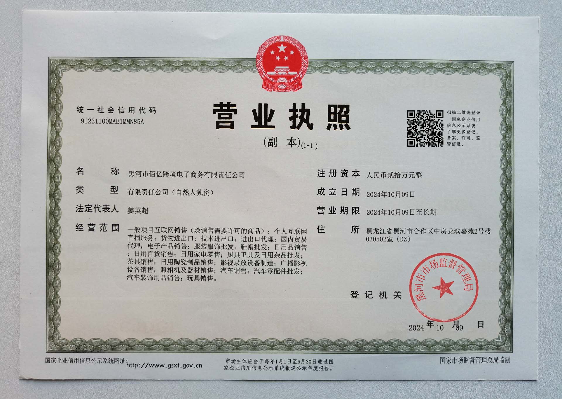 Corporate name:Heihe Baiyi Cross-border E-commerce Co., Ltd.